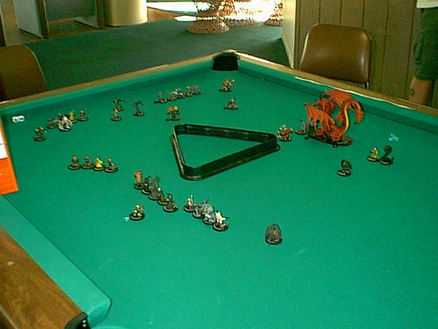 Mage Knight from WizKids - 2000. As you can see here, Mage Knight can be played almost anywhere. Our game here involved 3 players and 400-point armies. (The Great Fire Dragon was set to the Young Level for a point cost of 202.) We used half of the billiard table as our battlefield, making use of the triangle rack as our "forest" boundery. This specific game was played for about 4 1/2 hours and the Dragon prevailed. Return to the Mage Knight review