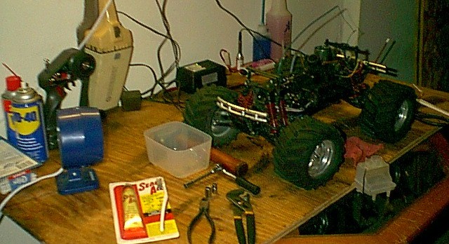 Don and NathanielFinally, I've sold my old Monte Carlo and I've got my R/C workshop set up in the garage. I've had my T-Maxx upside-down for months now waiting for this time to come.
